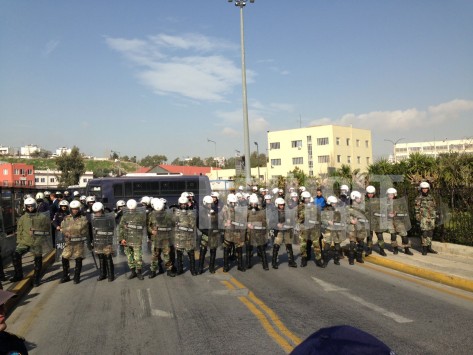 Αλλά λίγο πριν φτάσει η πορεία στο υπουργείο βρέθηκε μπροστά στο ανθρώπινο τείχος που είχαν σχηματίσει διμοιρίες των ΜΑΤ, των ΥΜΕΤ και ανδρών του Λιμενικού.